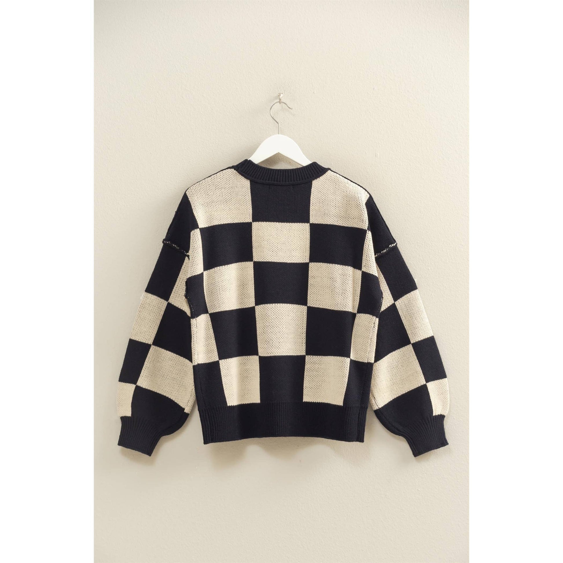 Elevate your wardrobe with this stylish sweater featuring a bold, checkered pattern for a pop of texture. Perfect for a casual outing or cozy indoor moments, its crew neck and relaxed fit ensure comfort all day long. Ideal for layering over a lightweight top or under a chic jacket as seasons shift.